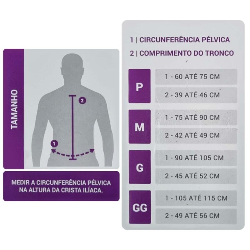 R: Meça o contorno pélvico e compare com a tabela de tamanhos: P (60-75 cm), M (75-90 cm), G (90-105 cm), GG (105-115 cm). As colunas verticais do colete são ajustáveis em altura e largura para garantir um ajuste ideal.