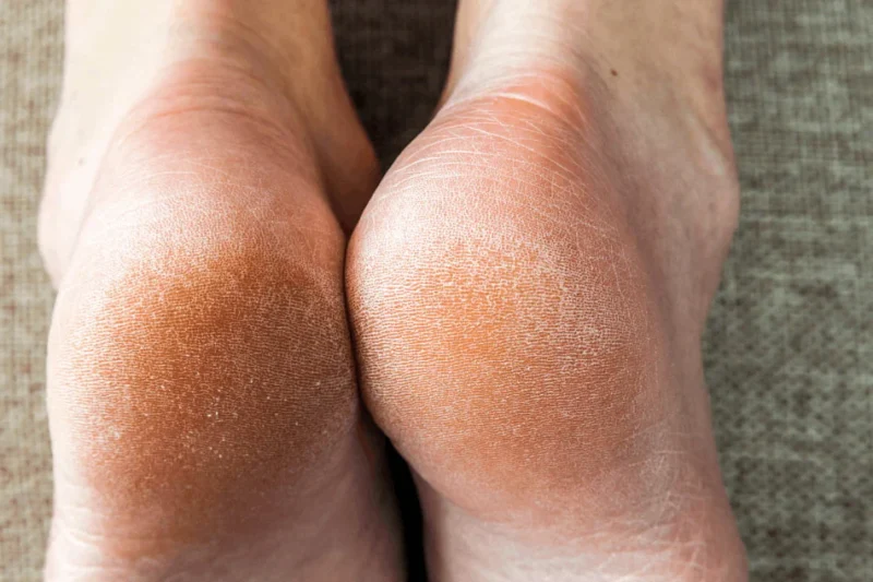 - Pés com ressecamento intenso, aspereza e fissuras superficiais.