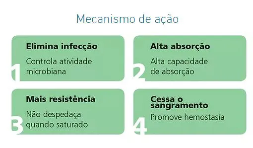 2. Alta absorção com gelificação: forma um gel em contato com exsudato, mantendo o leito hidratado.