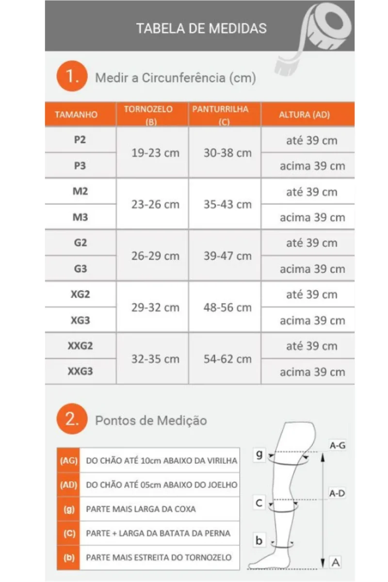 | Tabela de medidas G (Longa) | Tornozelo: 26-29 cm | Panturrilha: 39-47 cm | Altura: acima 39 cm |