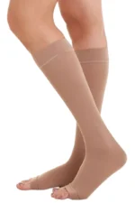 - Desenrole o restante da meia pela perna de forma suave e uniforme.