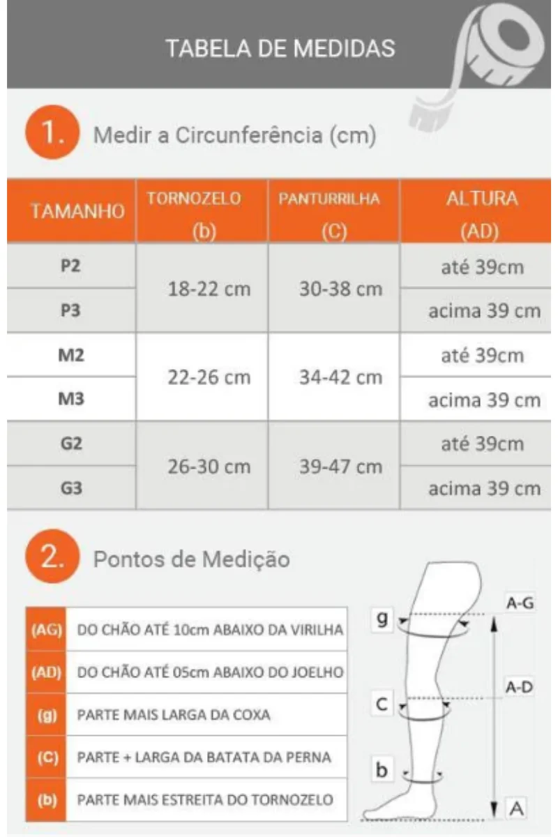 - Com uma fita métrica, meça as circunferências da sua perna conforme a tabela.