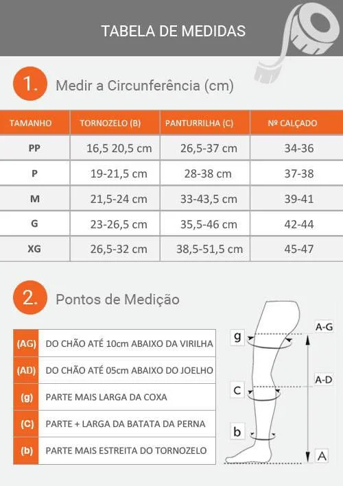 R: Meça a circunferência do tornozelo e da panturrilha e compare com a tabela de medidas para um ajuste perfeito.