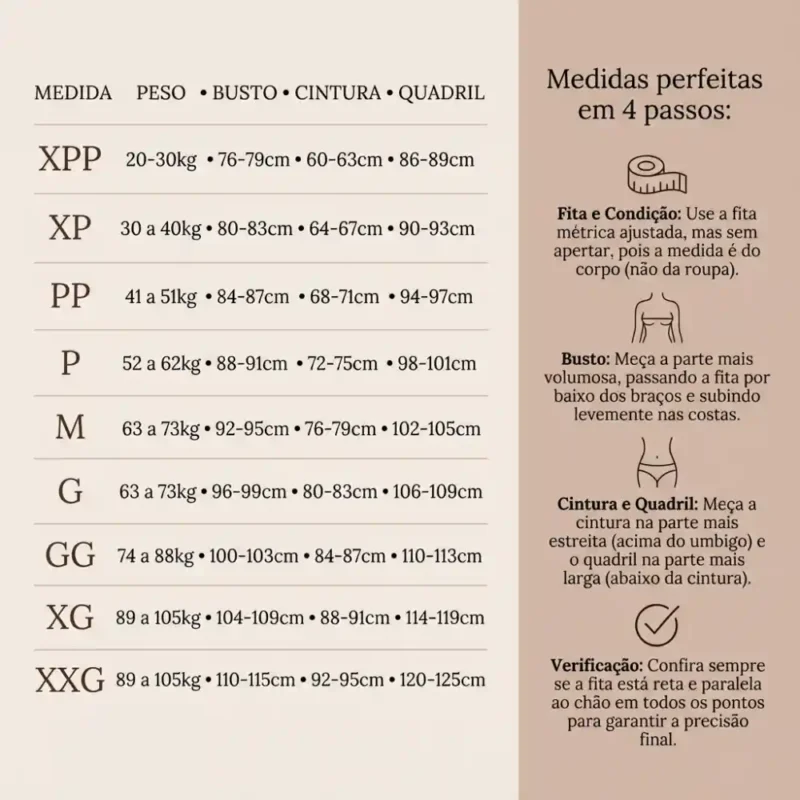 Tamanho PP 41–51kg • Busto 84–87cm • Cintura 68–71cm • Quadril 94–97cm