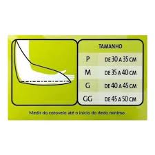R: Meça o comprimento do cotovelo até a base do dedo mínimo e consulte a tabela de tamanhos: PP (26-30 cm), P (31-35 cm), M (36-40 cm), G (41-45 cm), GG (46-50 cm).